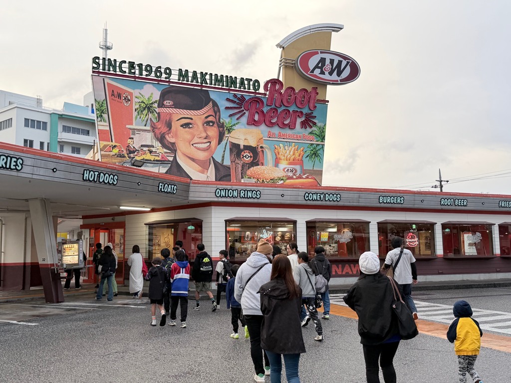 7時に集合して、フェニックスの保護者が運転するマイクロバスにフェニックスの子もジュニアの子も保護者も乗り込み、まずは沖縄にしかないハンバーガーチェーン:A&Wで朝食!